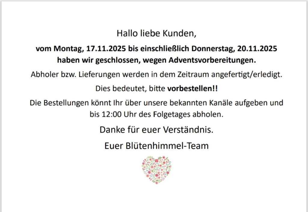 Wir von Blütenhimmel Birgit Weingartner freuen uns auf Ihr Feedback. Veröffentlichen Sie doch eine Rezension in unserem Profil. https://g.page/r/CV1fa5JDLKLQEBE/review